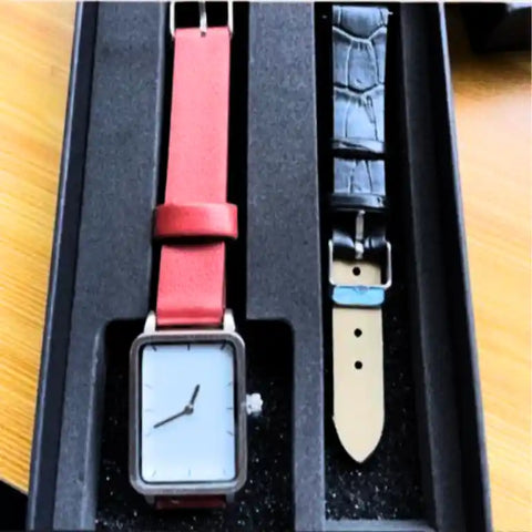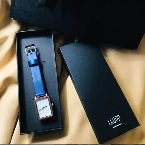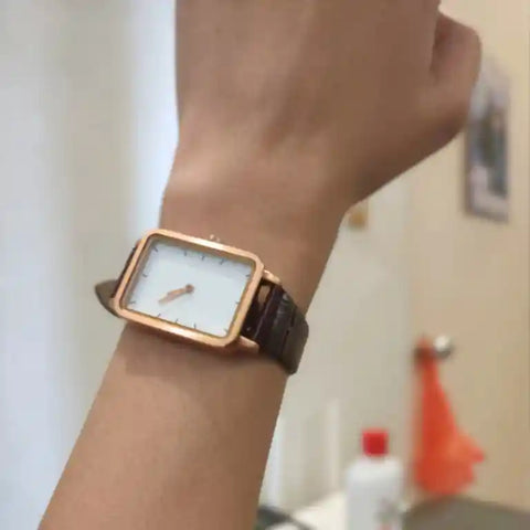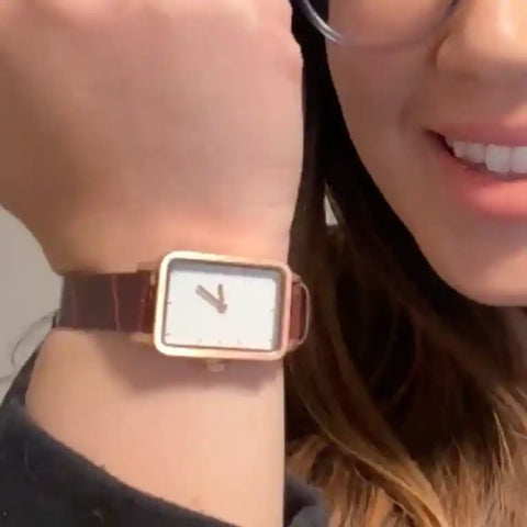 The Aki encapsulates modern-chic, featuring a sleek 32mm rectangular case in brushed metal finish.